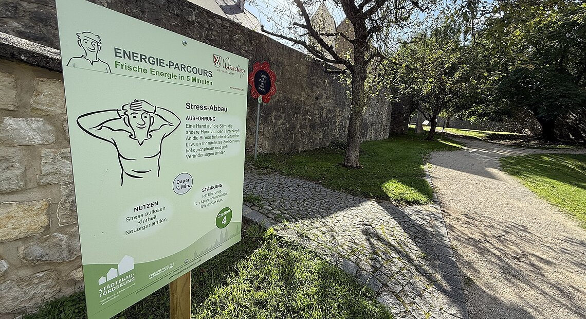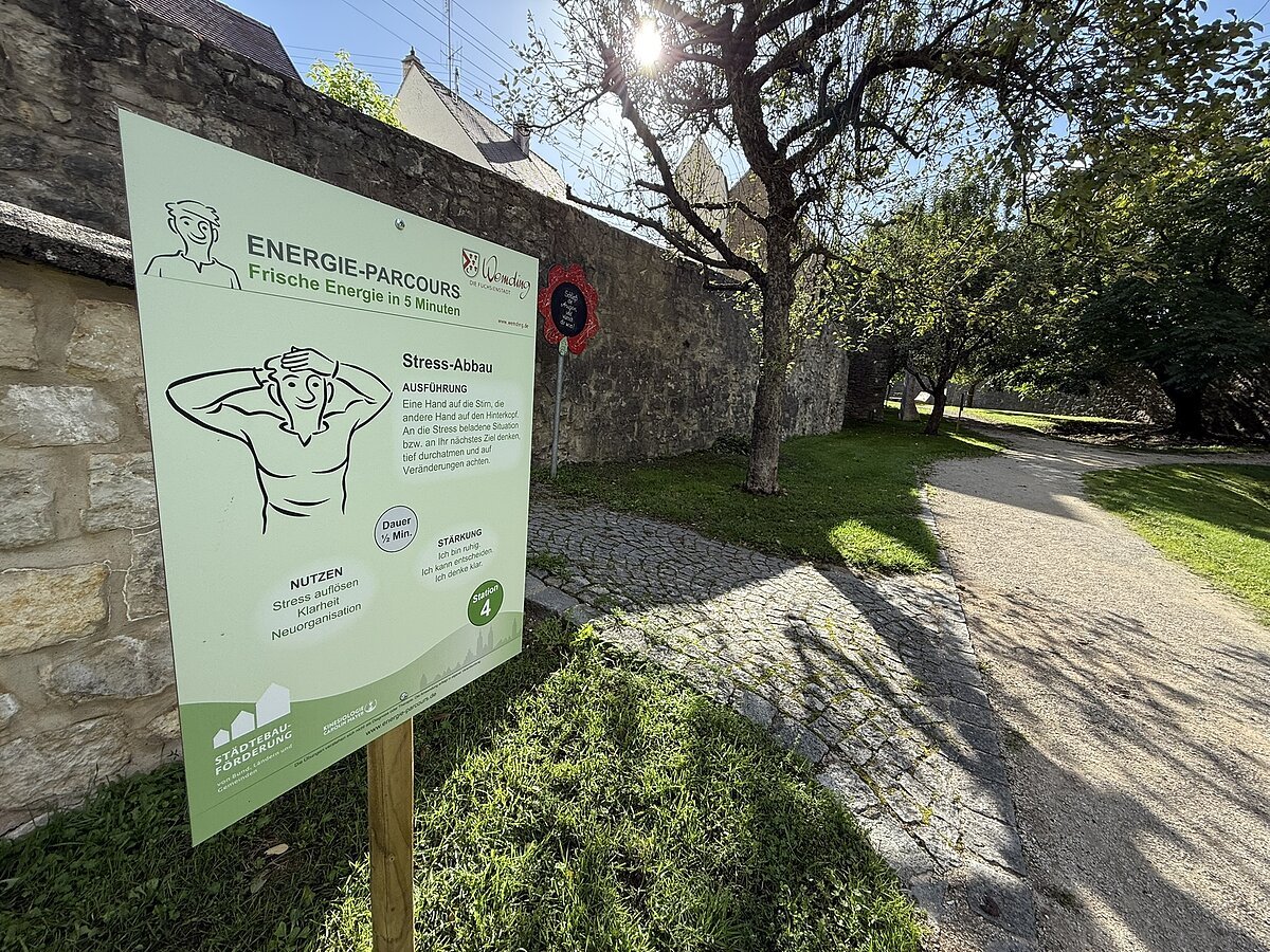 Stärke für Körper, Geist und Seele: Im historischen Stadtgraben Wemdings wurde vergangenen Herbst der Energie-Parcours eröffnet. Die Stadt lädt auf Initiierung von Carolin Mayer mit eigener Kinesiologie-Praxis in Laub die Bevölkerung herzlich ein, das neue Gesundheits- und Bewegungsangebot kennenzulernen. Der Parcours basiert auf acht einfachen neuro-energetischen Übungen, die innerhalb weniger Minuten zu mehr Energie, Balance und Gelassenheit führen können. In der Regel am ersten Sonntag im Monat um 14 Uhr sind Erwachsene aber auch Kinder ab sechs Jahren zu den Kennenlerntreffen willkommen. Treffpunkt ist die Starttafel. Die Anleitung dauert rund 30-45 Minuten.