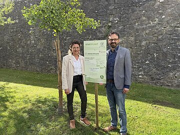 Bildunterschrift: Bürgermeister Dr. Martin Drexler freut sich gemeinsam mit Initiatorin Carolin Mayer über das neue Angebot in Wemding. Der Startpunkt wurde unmittelbar an einem Ginkgo-Baum gewählt – dem Symbol für Vitalität und positive Energie.
