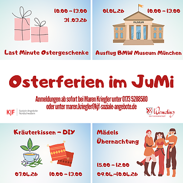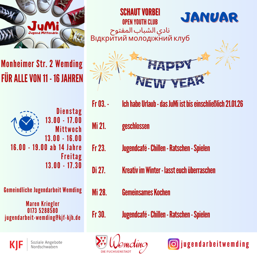 Geöffnet ist das „JuMi“ Dienstag und Mittwoch jeweils von 13 bis 17 Uhr sowie am Freitag von 13 bis 17:30 Uhr. Das Angebot richtet sich vorwiegend an Jugendliche von 11 bis 16 Jahren. Kontakt zu Jugendarbeiterin Maren Kriegler: Telefon 0173/5288580, E-Mail: maren.kriegler@kjf-soziale-angebote.de