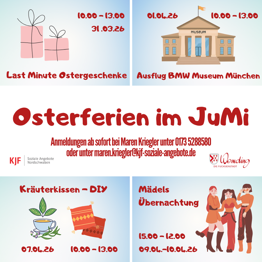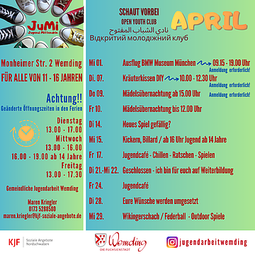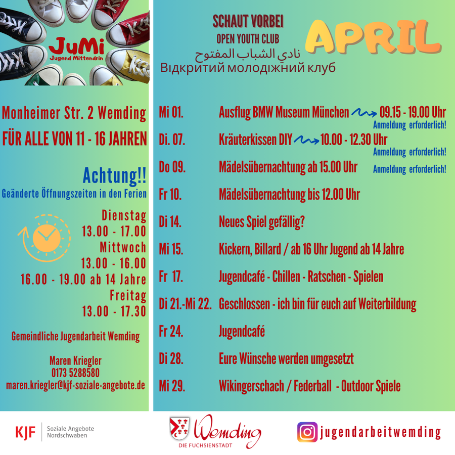 Aktuelle News und Aktivitäten gibt es auch regelmäßig auf Instagram "jugendarbeitwemding". In den Sommerferien sind zahlreiche Veranstaltungen über das Ferienprogramm der Stadt Wemding buchbar.