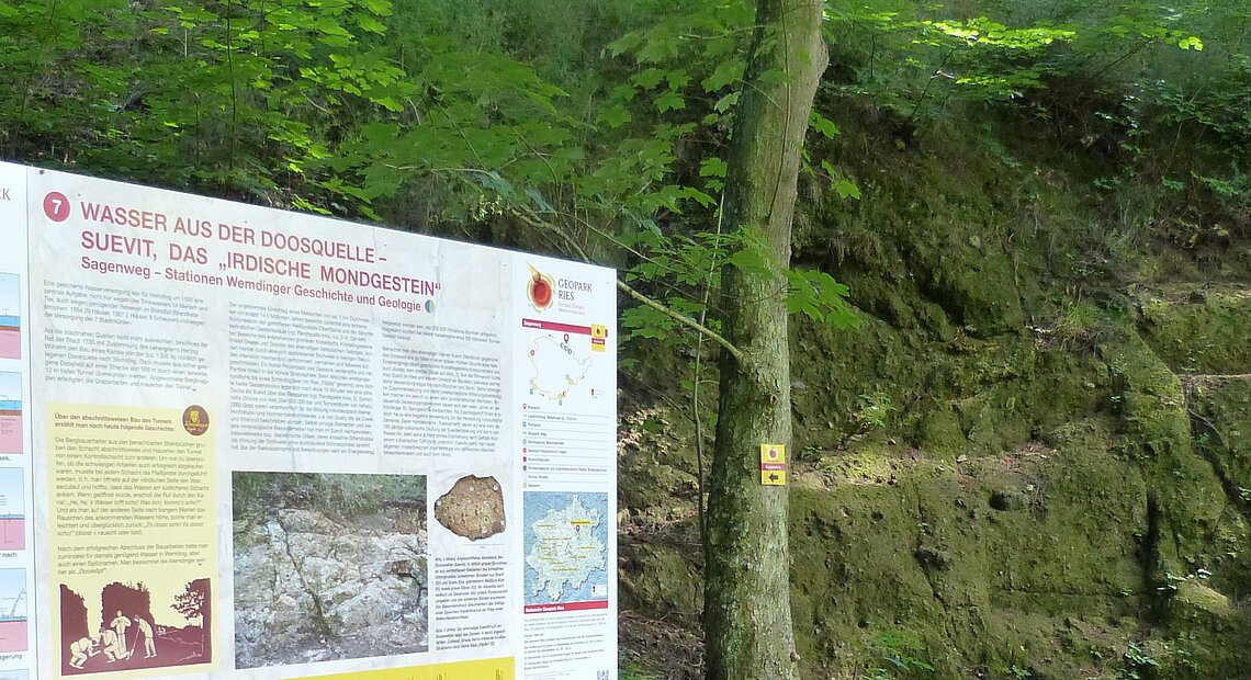 Der Suevitsteinbruch wird vor Ort durch eine Informationstafel erläutert.