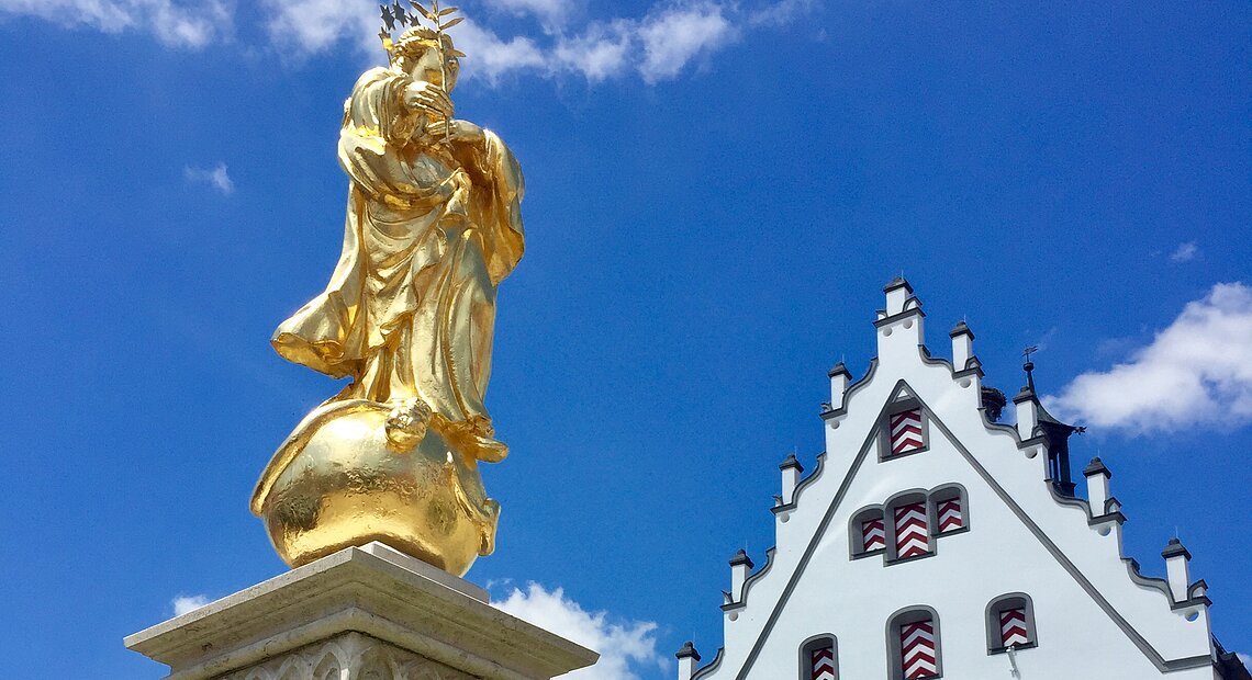 Hoch aufragende Fassade des historischen Rathaus mit einem blauen Himmel im Hintergrund. Im Vordergrund steht eine goldene Marienstatue mit Brunnen.