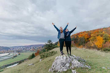 Vom Unteren Burgparkplatz führt der Weg auf idyllischen Wanderwegen hinab in die historische Altstadt zum Marktplatz mit historischem Brunnen. Auf einem Felsen über der Stadt thront hier majestätisch das Schloss Harburg, dessen Geschichte bis in das 11. Jahrhundert zurückreicht. Markante Landschaftsformationen säumen den Verlauf der Wörnitz – das einzige Fließgewässer, welches das Ries entwässert. Über artenreiche Magerrasen geht es zum Mähhorn oberhalb von Huisheim, das einen herrlichen Ausblick über das gesamte Ries erschließt. Am Geotop Kalvarienberg Gosheim eröffnet ein Steinbruch Einblicke in die Geologie des östlichen Kraterrandes. Durch Wälder quert man das Schwalbtal und wandert oberhalb des Wemdinger Steinbruchs entlang. Der Wemdinger Walderlebnispfad lockert den Etappenschluss mit Rätseln und Informationen zum Wald und seinen Bewohnern auf und ist insbesondere für Kinder attraktiv. Die erste Etappe endet an der Touristen-Info mit der nahe gelegenen Geopark-Infostelle Wemding.