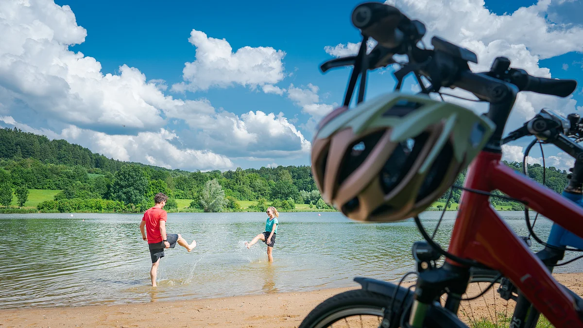 Beim Mörnsheimer Ortsteil Altendorf biegt die Route ab ins Gailachtal. Auch hier spielen Steinabbau und Fossilien eine große Rolle. Durch die Karstlandschaft der Monheimer Alb gelangt man ins Jurastädtchen Monheim. Jetzt sind bereits Spuren des Meteoriteneinschlags zu sehen – lange bevor der eigentliche Krater näher rückt. In Wemding mit der bekannten Wallfahrtsbasilika „Maria Brünnlein“ sind die Radler dem Kraterrand ganz nah. Bei Polsingen trifft man bald darauf im Suevit-Steinbruch auf Impaktgestein, das bei dem Einschlag entstand. Anschließend geht es weiter Richtung Norden bis ans Ufer des Hahnenkammsees, eines der sieben Badeseen im Fränkischen Seenland. In östlicher Richtung führt der Weg nun hinunter ins Altmühltal und zurück nach Treuchtlingen.
